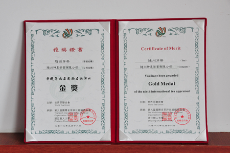 2012年9月,我公司生產的“隨州芽茶”榮獲第九屆國際名茶評比“金獎”